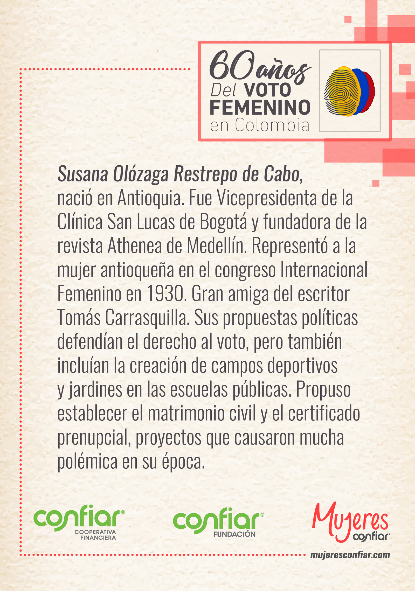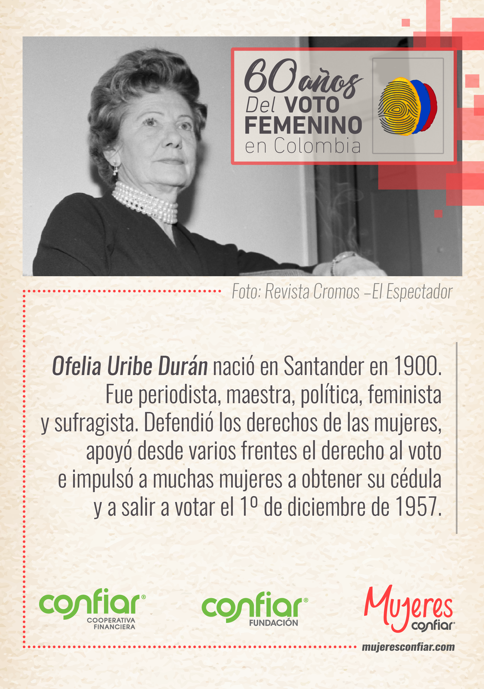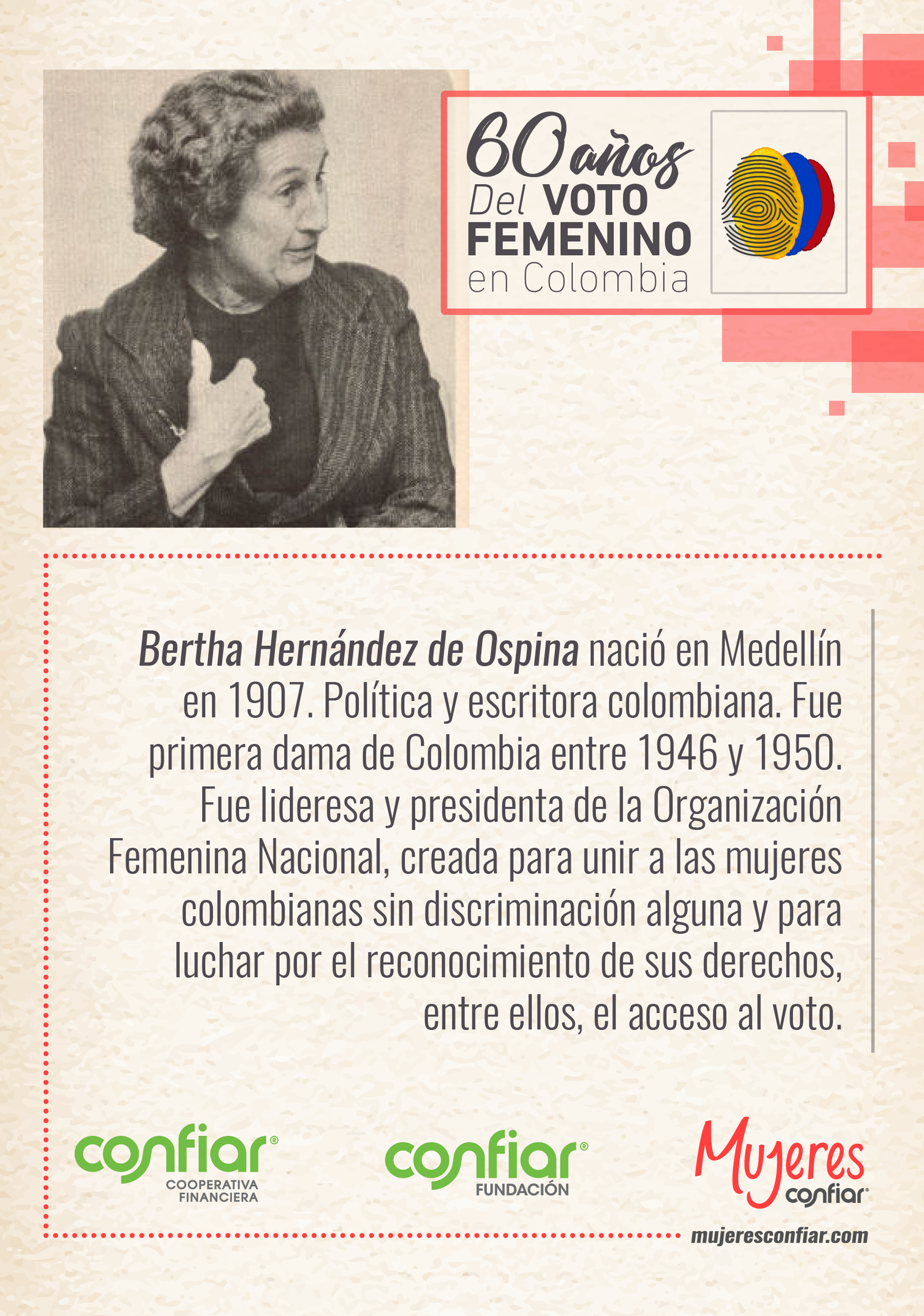Hace 60 años, el 1º de diciembre de 1957, por primera vez, las mujeres en Colombia pudieron ejercer su derecho al voto. Detrás de la consecución de este derecho hay cientos de historias de mujeres que hicieron posible este paso en favor de la democracia y la equidad en nuestro país. Entre ellas están las primeras graduadas de universidades, las primeras representantes políticas, las primeras mujeres en obtener cargos públicos: educadoras, abogadas, escritoras, luchadoras sociales, periodistas, mujeres que fueron pioneras en sus campos y demostraron que la vida pública no tenía distinción de género. A pesar de sus diferentes miradas, posturas, creencias y afinidades políticas, estas mujeres unieron sus voces desde diferentes ciudades del país por el mismo objetivo: los derechos de las mujeres.