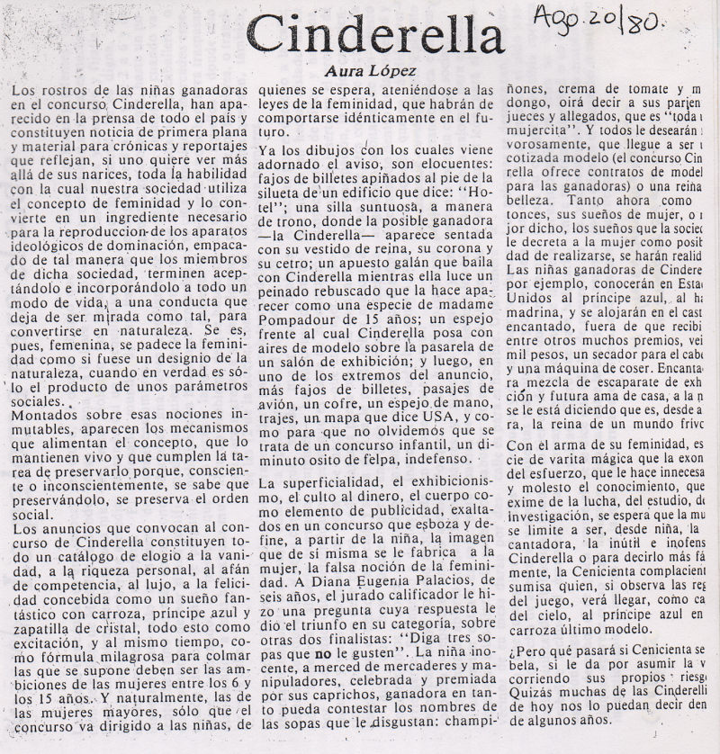 Los rostros de las niñas ganadoras en el concurso, Cinderella, han aparecido en la prensa de todo el país y constituyen noticia de primera plana y material para crónicas y reportajes que reflejan, si uno quiere ver más allá de sus narices, toda la habilidad con la cual nuestra sociedad utiliza el concepto de feminidad y lo convierte en un ingrediente necesario para la reproduccion de los aparatos ideológicos de dominación, empacado de tal manera que los miembros de dicha sociedad, terminen aceptándolo e incorporándolo a todo un modo de vida, a una conducta que deja de ser mirada como tal, para convertirse en naturaleza. Se es, pues, femenina, se padece la feminidad como si fuese un designio de la naturaleza, cuando en verdad es sólo el producto de unos parámetros sociales.