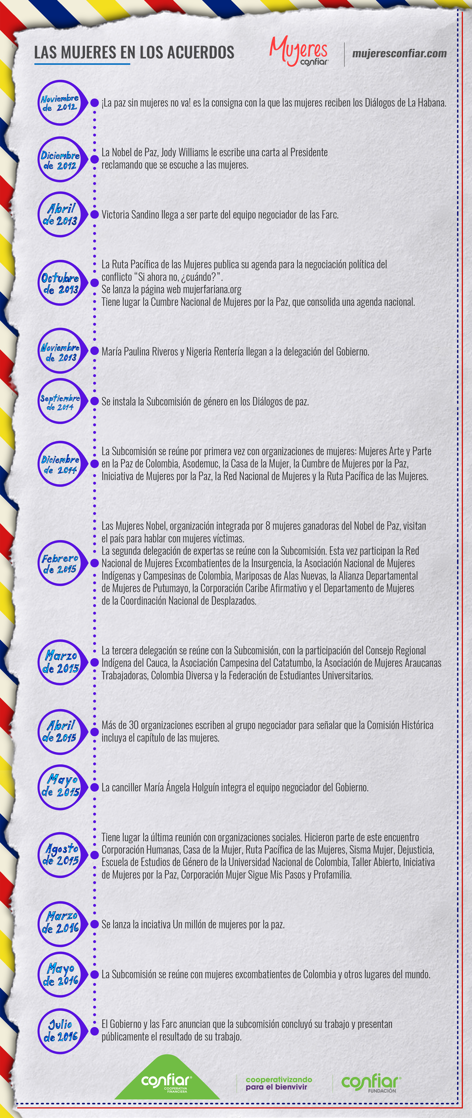 Por estos efectos particulares que ha tenido el enfrentamiento armado en la vida de las mujeres se creó una Comisión de género para el Proceso de Paz, a mediados de 2014, cuando se estaba dando la discusión sobre el punto de Víctimas en la Mesa de La Habana. Fue la primera comisión formal para garantizar el enfoque de género en un proceso de paz en el mundo. Producto de su trabajo, hoy existe una Instancia especial de mujeres que garantizará que se cumpla lo pactado en cuanto a sus derechos.