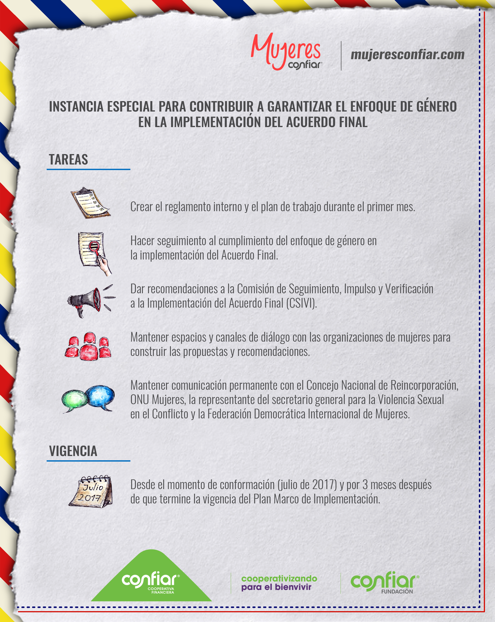 La Instancia especial para contribuir a garantizar el enfoque de género en la implementación del Acuerdo Final se conformó en julio de 2017. Está integrada por siete mujeres elegidas por las organizaciones y que estarán en ese cargo durante los primeros de años de la Instancia.