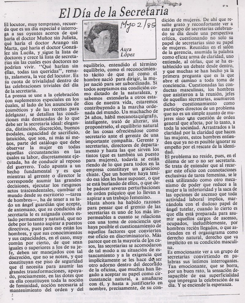 Hasta ahora ha habido razones para pensar que el gremio de las secretarias es uno de los más impermeables a cuanto se relaciona con una toma de conciencia que haya posible el cuestionamiento de aquellos factores que convierten ese oficio en discriminatorio. Más parece que en la mayoría de los casos, las secretarias se acomodaron de tal modo a su situación de estancamiento y a la exigencia que implícitamente se les hace de ser otro adorno dentro del decorado de la oficina, que muchas han llegado a aceptar su papel como circunstancia natural, a amañarse con él, y hasta a justificarlo en nombre, precisamente, de su condición de mujeres. De ahí que resulte grato y reconfortante ver a este grupo de secretarias celebrando su día desde una perspectiva crítica, cuestionando no solo su papel de secretarias sino su papel de mujeres. Reunidas en el salón de la gerencia, asumida la palabra como eficaz arma de claridad, uno entiende, al oírlas, que se ha establecido un debate desde dentro, y que muchas se han hecho ya la primera pregunta que es la que abre el camino a toda toma de conciencia.
