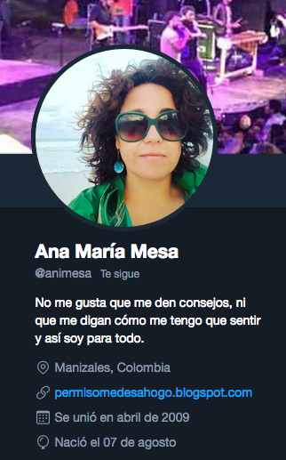 Nuestra primera invitada del 2018 a la entrevista twittera es Ana María Mesa Villegas, conocida como @animesa en el mundo de las redes sociales. Ana María vive en Manizales, estudió administración de empresas en la Universidad EAFIT, pero ejerció como profesional de esa área durante pocos años porque siempre se interesó más en el arte y la cultura. Trabajó con la Orquesta Sinfónica de Caldas e hizo parte de su junta directiva, así como de la junta de la Corporación Jazz Manizales que realizaba los Festivales Internacionales de Jazz en la ciudad. En el año 2005 empezó a trabajar como directora de la Emisora Cultural Radio Cóndor de la Universidad Autónoma de Manizales y comenzó a hacer radio. Desde el 2014 trabaja como periodista en Radio Nacional de Colombia, hace un año dicta clases en la Universidad de Manizales y hace un mes es columnista del periódico La Patria.