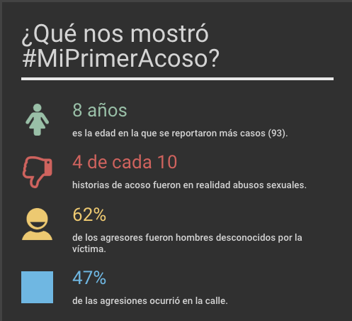 La conclusión más «fea» que les permitió visibilizar esta campaña «es que el acoso comienza a los 6 o 7 años y eso nos dice que no nos acosan porque estemos buenas”, me dice Catalina sin ocultar el rechazo que estos datos le siguen generando. «Una niña de 6 años no tiene ninguna diferencia a un niño de la misma edad, la están atacando porque pueden, porque hay una desigualdad de poder tan grande que a la niña la pueden atacar en cualquier momento». Otra de las conclusiones que preocupa tiene que ver con el número de tuits que recibieron – hasta 410 por minuto-, pues si la cifra de mujeres acosadas es grande, “¿esos acosadores dónde están?”. Seguramente todas conocemos a uno, a dos o a varios, y «hay que empezar a llamar a cuentas a los hombres que tenemos a nuestro alrededor y hacer con ellos ese ejercicio de autocrítica», como lo hicieron algunos hombres que también participaron de #Miprimeracoso en el año 2016.