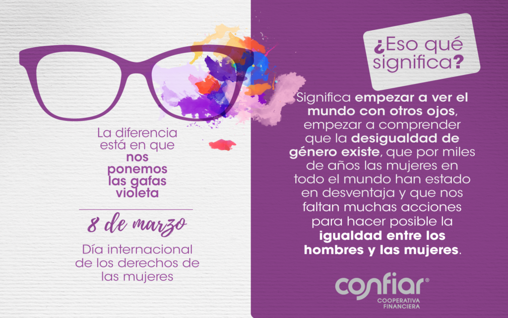Consciente del alto porcentaje de mujeres trabajadoras y asociadas con el que cuenta, la Cooperativa Financiera Confiar comenzó una campaña pedagógica y de sensibilización que prepara a su base social y a su equipo de trabajo para el 8 de marzo, fecha para ponerse las gafas violeta. Así, se sigue abriendo el camino para avanzar en la igualdad de género.