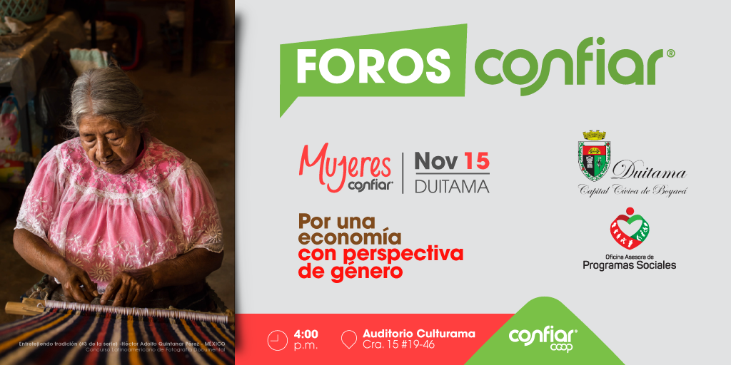 Y por último, el sábado 24 de noviembre se llevará a cabo en la ciudad de Medellín, el foro anual de Confiar, considerado por la Cooperativa como su más importante evento académico. Este tendrá lugar en el Auditorio Comfama San Ignacio (calle 48 # 43-87, cuarto piso) de 8:00 a.m. a 1:00 p.m. Las invitadas encargadas de generar la conversación y el debate sobre las mujeres en el ámbito económico serán Natalia Moreno Salamanca, economista, magíster en Estudios de Género, integrante de la Mesa de Economía Feminista y activista de #MenstruaciónSinImpuestos; Angélica Sáenz Sotomonte, trabajadora social, magíster en Cooperación internacional y ayuda humanitaria y oficial territorial de Género de ONU Mujeres; Ana Teresa Vélez Orrego, trabajadora social, magíster en Educación y Desarrollo humano, quien desde la Escuela Nacional Sindical participa de los procesos asociados a economía del cuidado y trabajo decente. A ellas las acompañará Marta Restrepo López, trabajadora social que hace parte del equipo de la Red Feminista Antimilitarista.