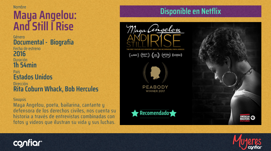 Maya Angelou: And Still I Rise (Aún así, me levanto), es un documental, disponible en Netflix, que rinde homenaje a la poeta, escritora, cantante, actriz y defensora de los derechos civiles, Maya Angelou. A través de una serie de entrevistas realizadas a ella y a quienes estuvieron cerca, enlazadas con fotos y videos, nos cuentan la notable travesía de su vida.