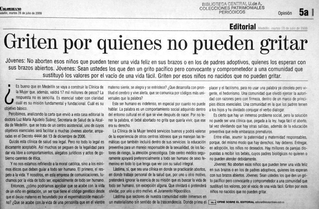 Estos señalamientos llevaron a que en el 2009, miles de personas salieran a las calles a manifestarse a favor y en contra de la Clínica, volcando decenas de opiniones en medios masivos de comunicación, en los que incluso se hicieron públicas posiciones editoriales como la difundida por El Colombiano, un periódico regional de alto consumo en el país, que el 28 de julio tituló: «Griten por quienes no pueden gritar».