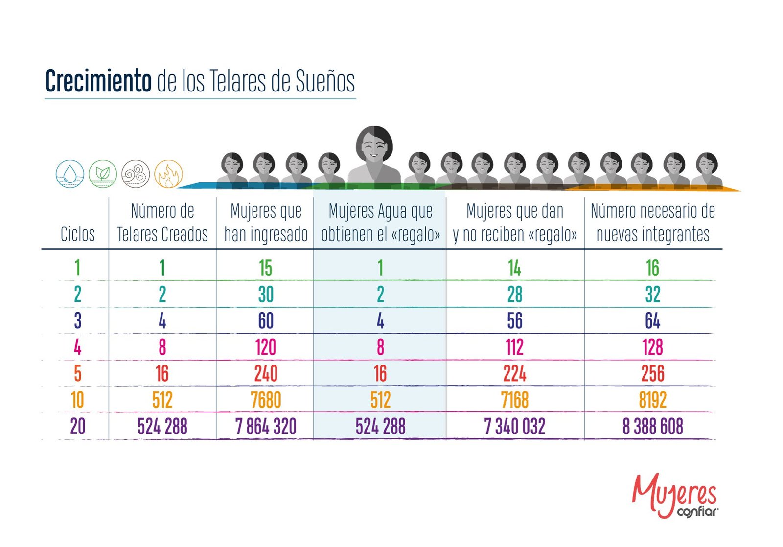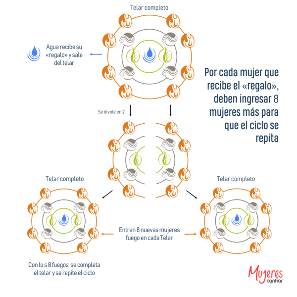 Se presentan como círculos de mujeres compuestos por cuatro niveles: Agua (1 mujer), Tierras (2 mujeres), Vientos (4 mujeres) y Fuegos (8 mujeres). Cada Telar está compuesto por 15 mujeres en donde las 8 fuegos dan un “regalo” de 1440 dólares (4,6 millones de pesos) para que la mujer agua pueda cumplir su sueño de recibir hasta 31.680 dolares (con los procesos de reciclado), y finalmente salir del Telar. En este punto, cada mujer tierra pasa a ser agua y el Telar se divide en dos, teniendo que buscar cada Telar otras ocho mujeres fuego, y así sucesivamente hasta que no hay más personas para ingresar y los telares colapsan.